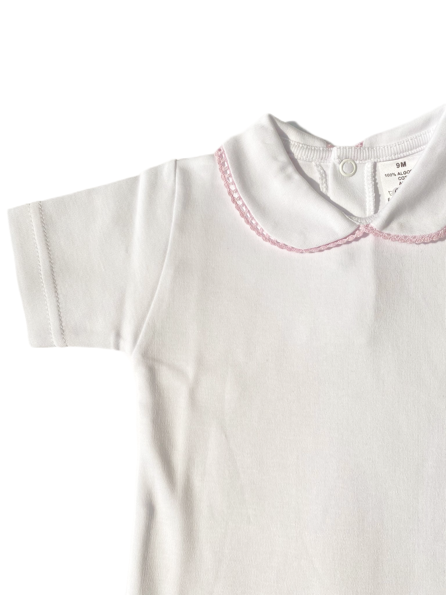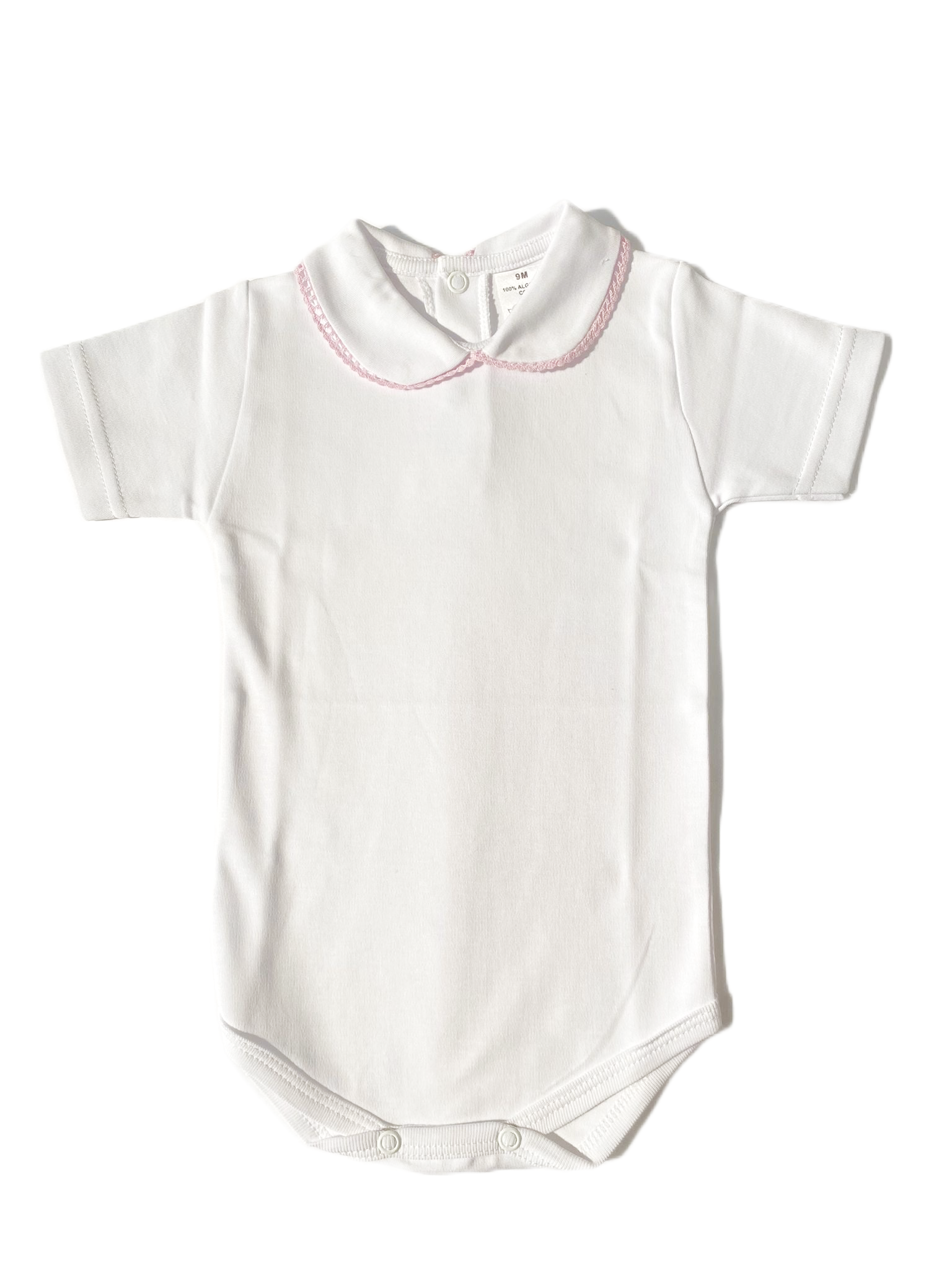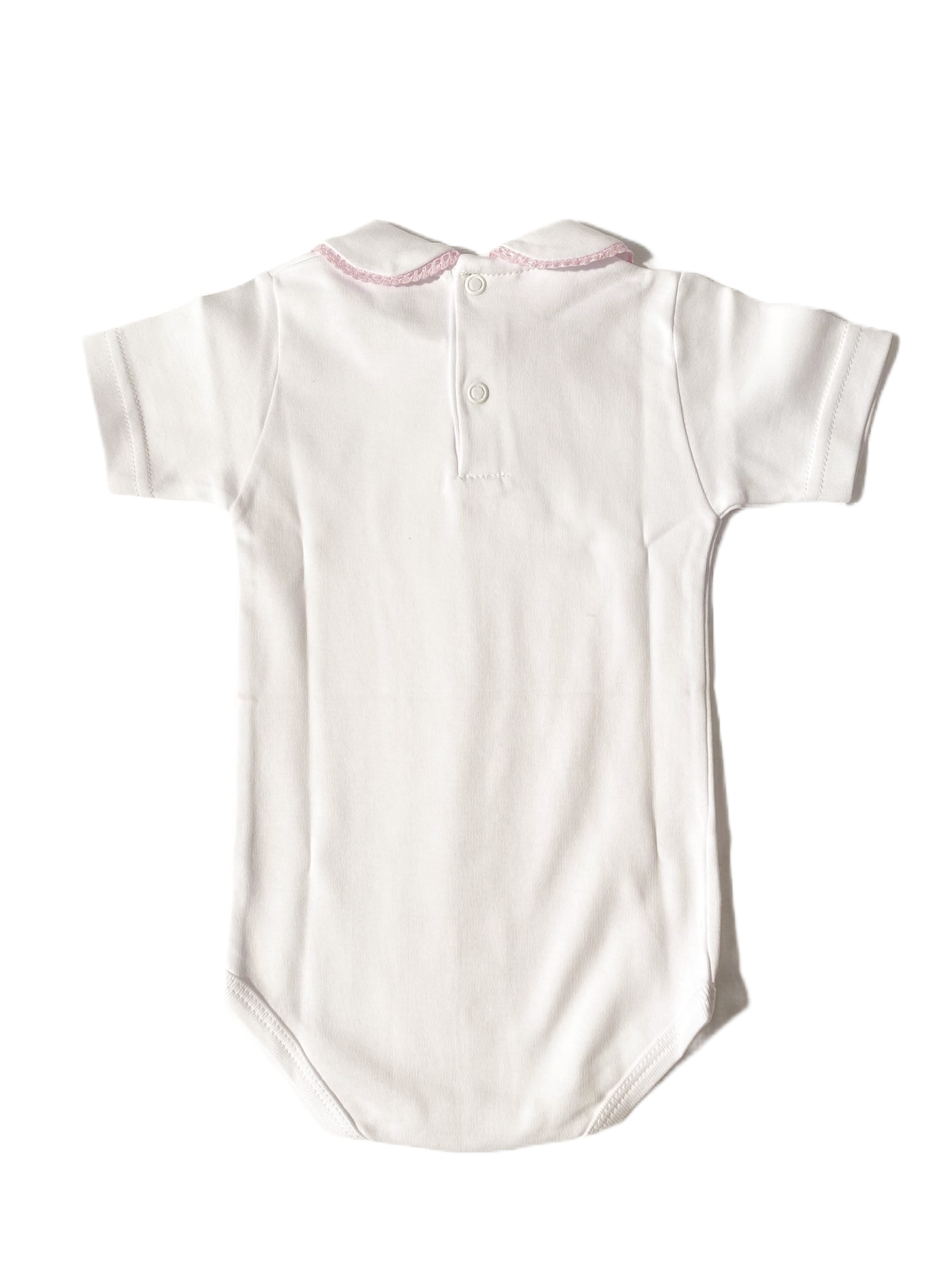 Merveilleux body avec le détail en dentelle rose autour du col. Idéal pour compléter un look avec une jolie robe ou barboteuse.