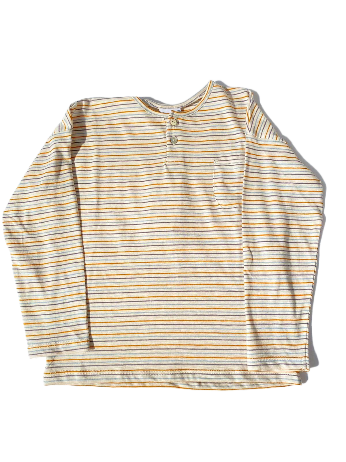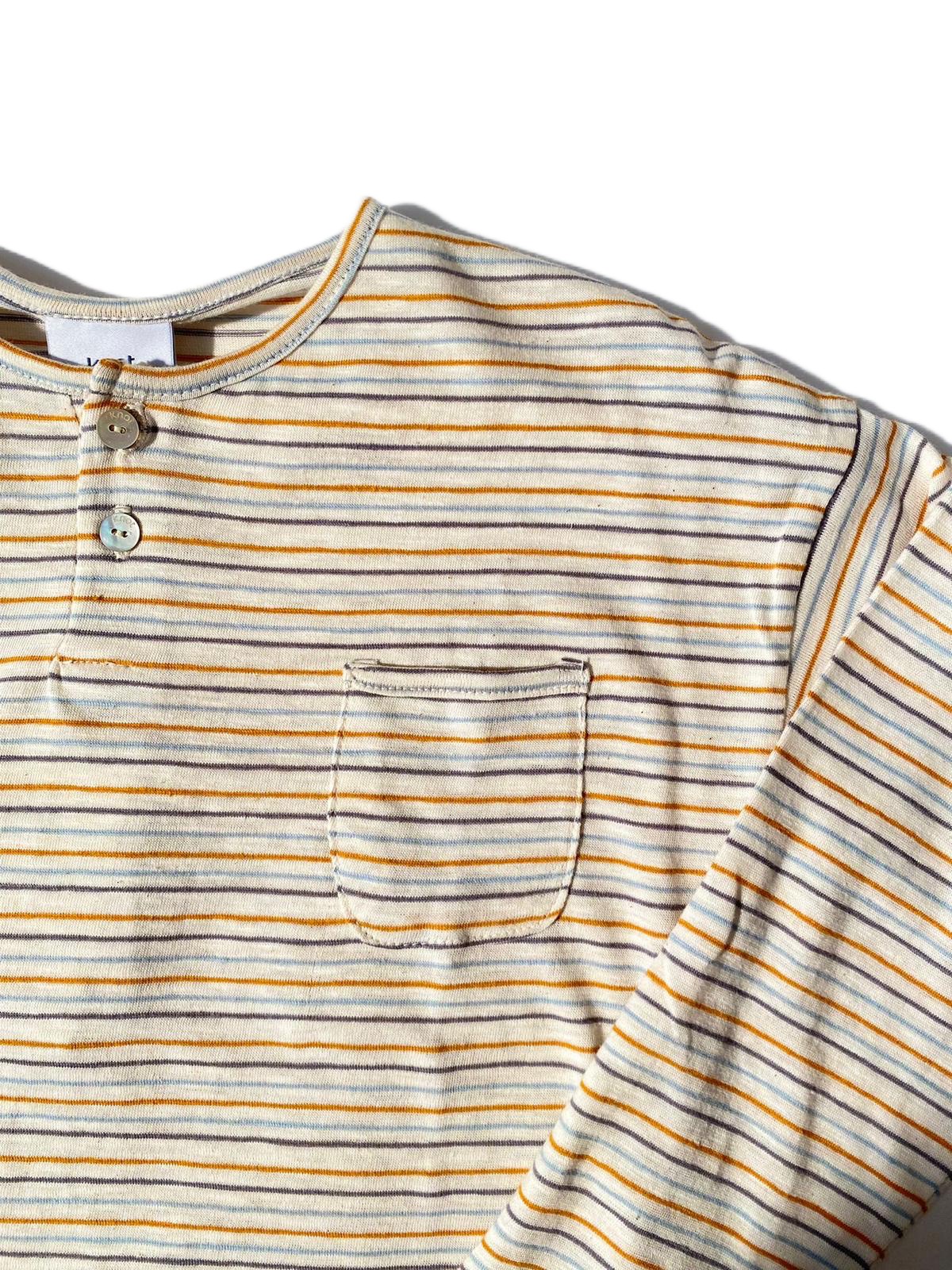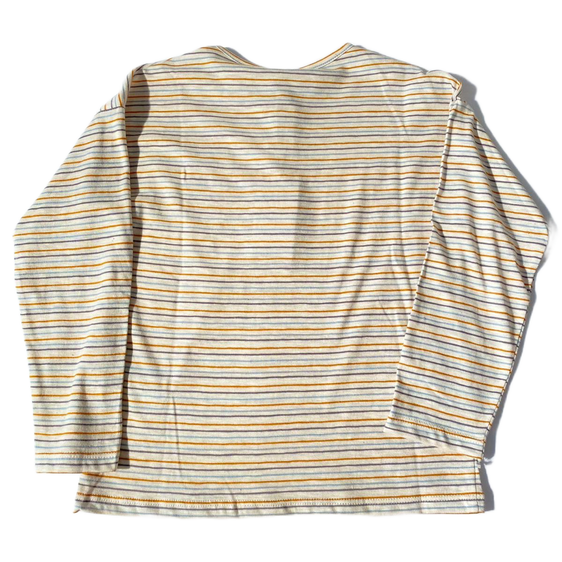 Pour votre enfant, un basique à avoir dans l'armoire: le t-shirt manches longues avec une petite poche sur le côté et de fines rayures.