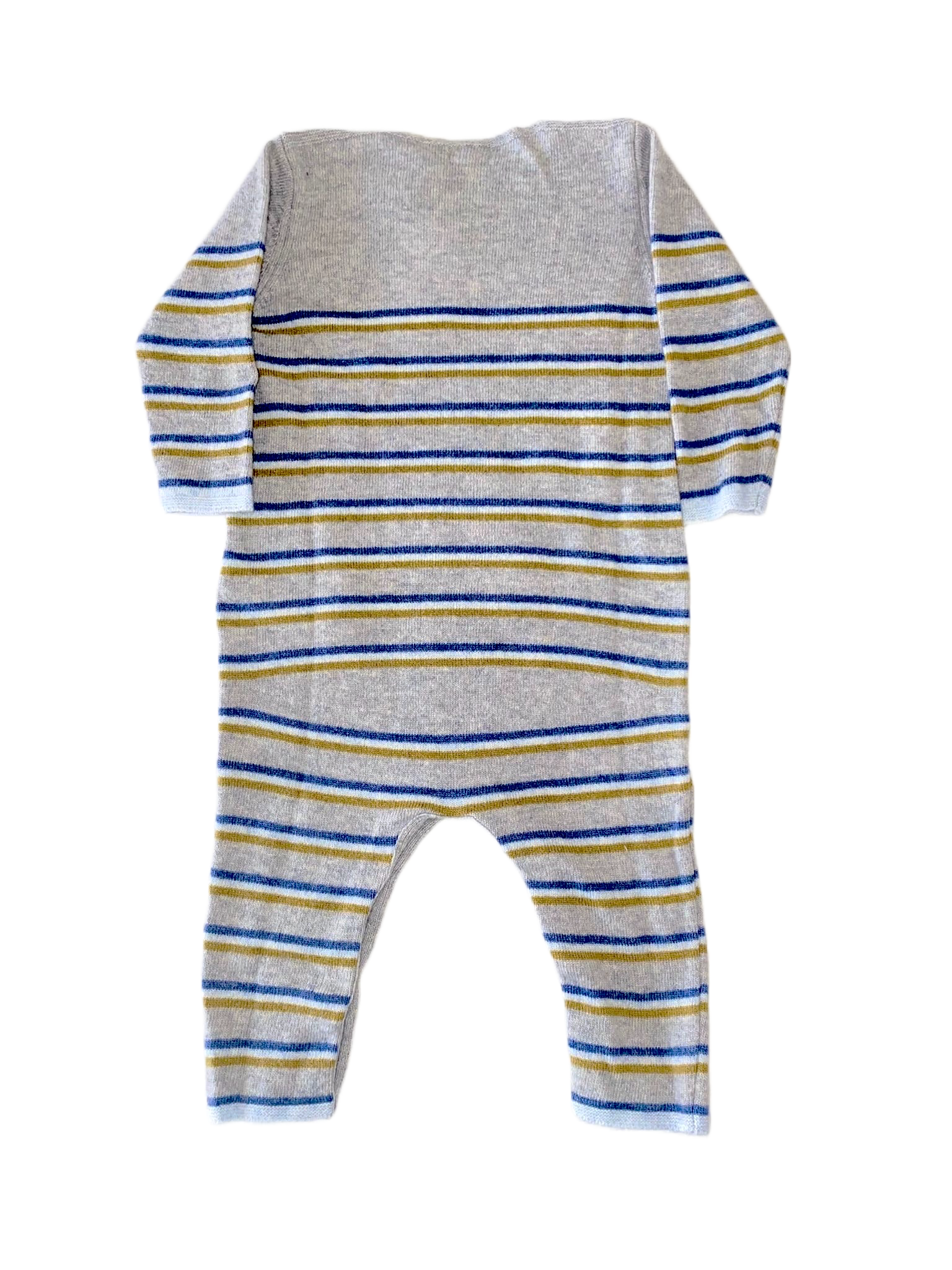 Combinaison en tricot et cachemire rayée avec ouverture sur les épaules ainsi qu'au niveau de l'entre-jambes, pour tenir au chaud nos tout-petits pendant l'hiver.
