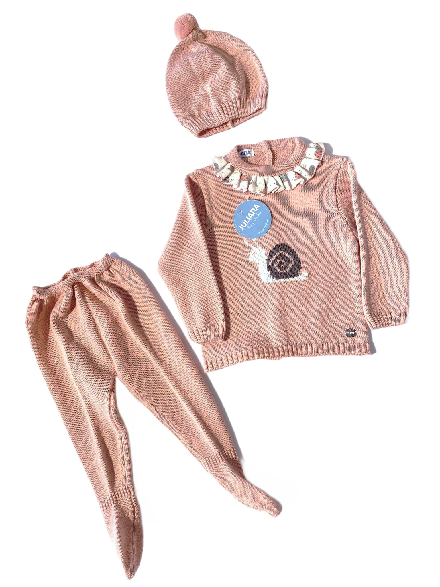 "Petit escargot porte sur son dos, sa maisonnette..." Ensemble bonnet, pull et collant avec pieds de la jolie marque Juliana. Bien au chaud et bien emmitouflé !