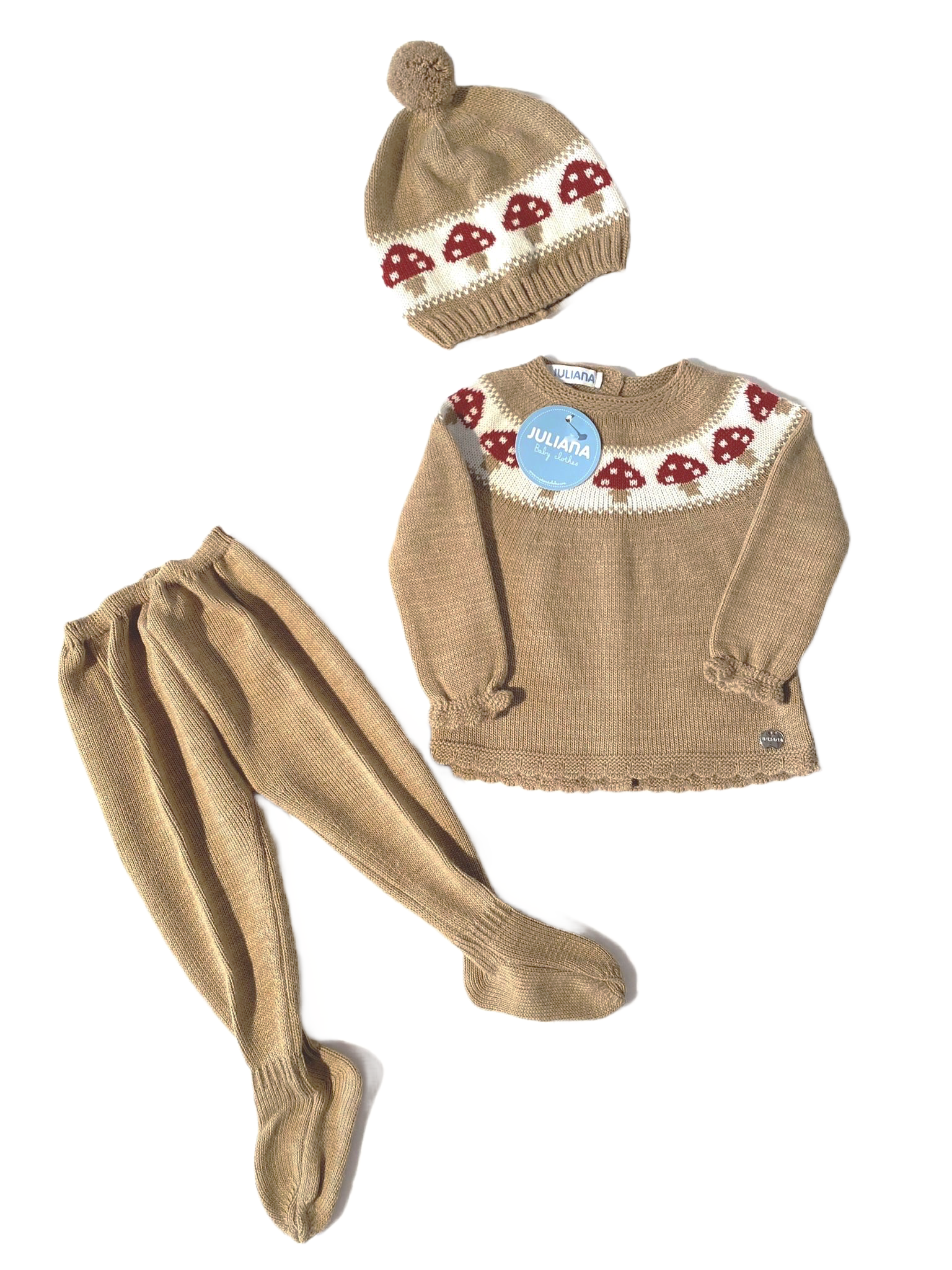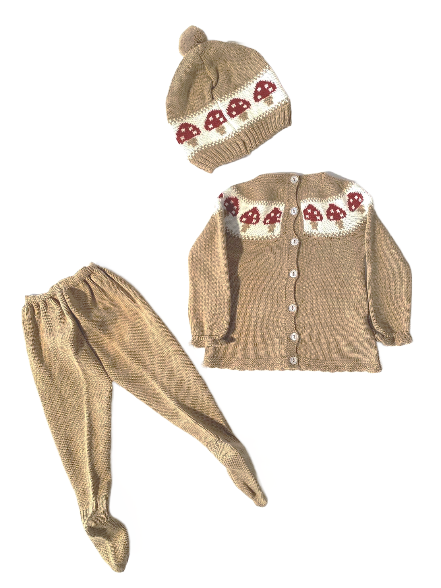De la collection Mushroom, un ensemble trois pièces composé d’un legging avec pied, un haut manches longues et de son bonnet à pompon. Un ensemble à croquer !