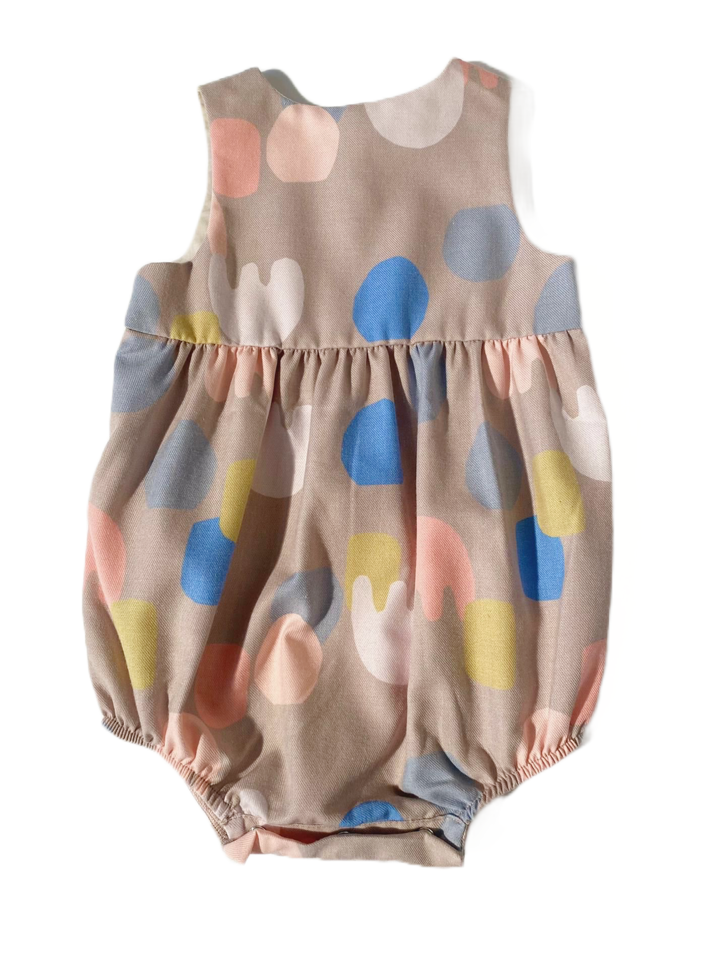 Petite barboteuse colorée, de la marque Knot, avec trois boutons à l'avant et des boutons de pression à l'entrejambe.