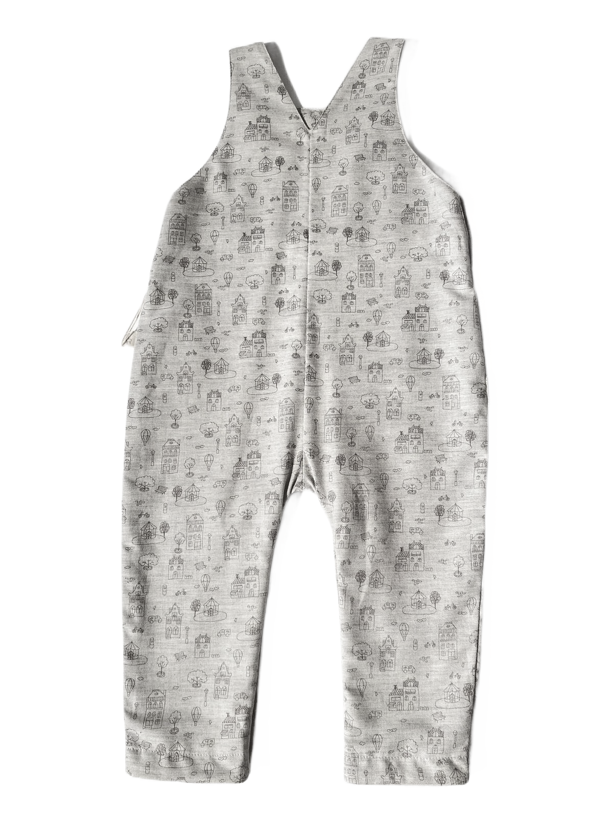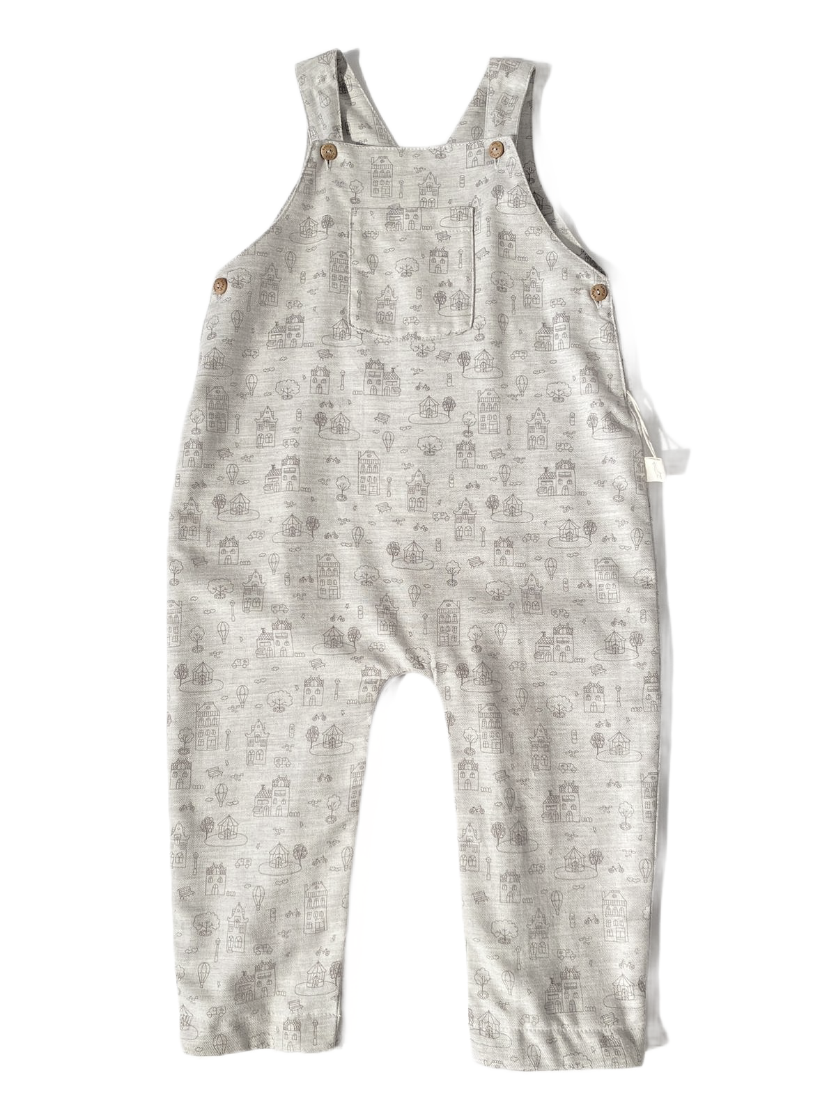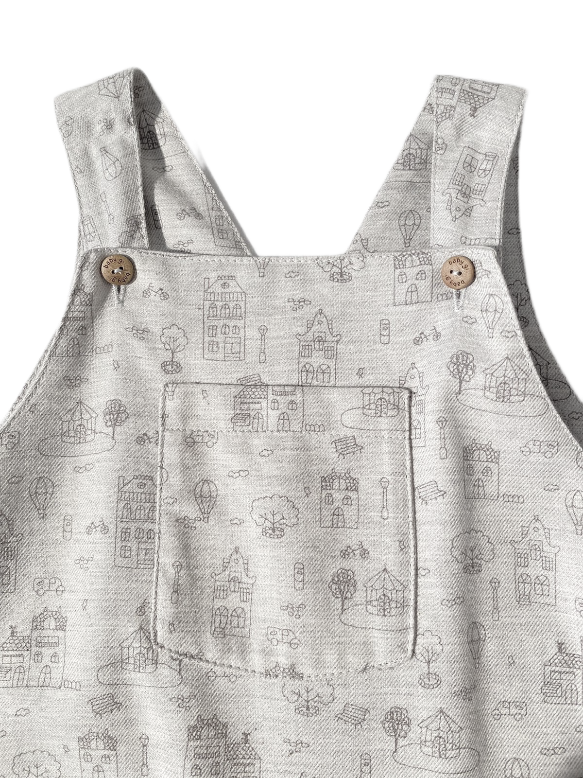 Salopette grise trop mignonne de chez Baby Gi, avec de jolis détails imprimés d'un village. Baby Gi, notre coup de cœur !